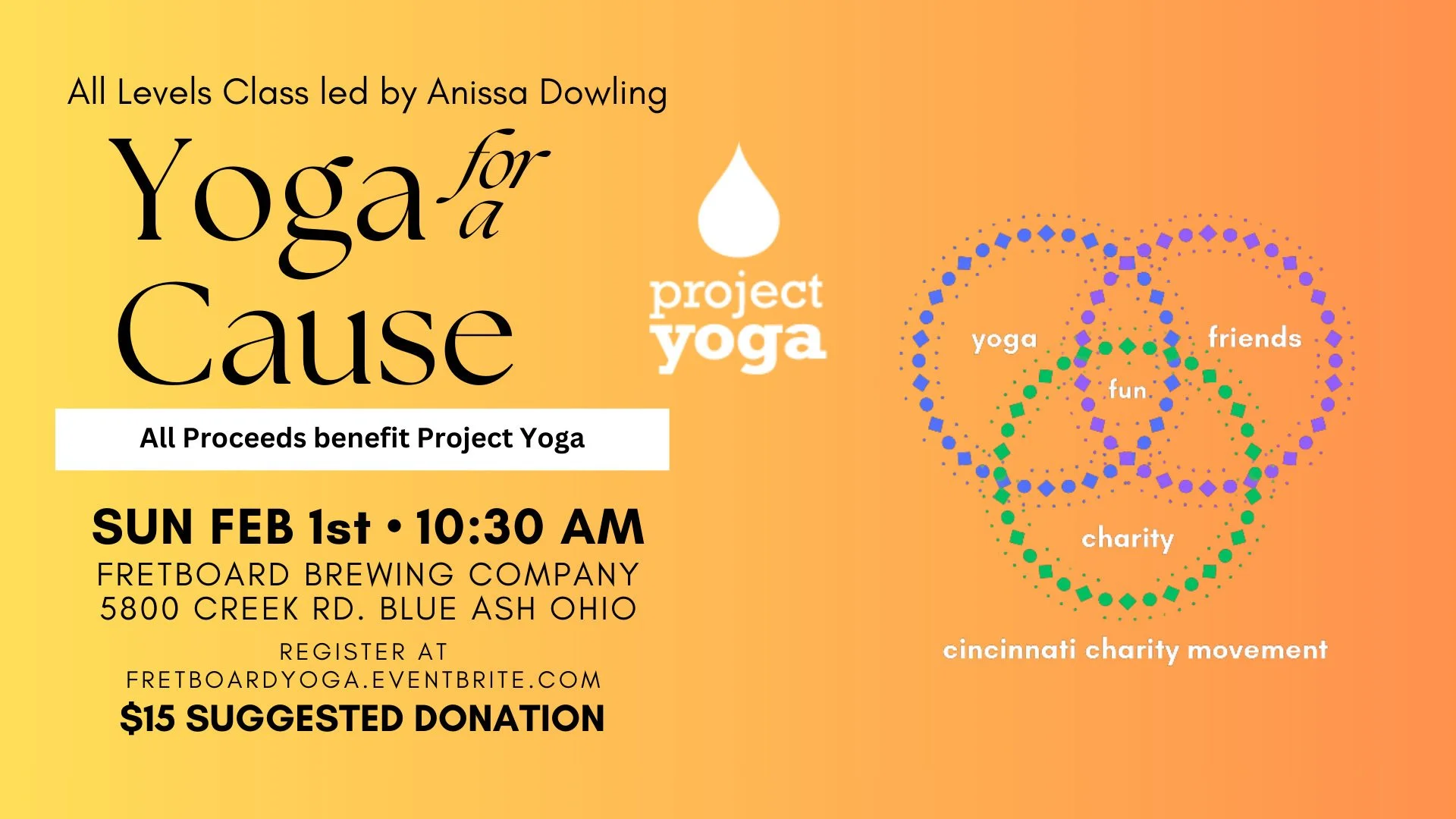 About: Join us for an all-levels yoga class to benefit the mission of Project Yoga. 100% of all donations go directly to the charity. We thank Fretboard Brewing for donating the space and Anissa Dowling for donating her time and talent in leading the yoga class that is always fun and perfect for all levels.